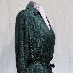 Dex Jade Green Cheetah Print Blouse with Gathered Ribbon Waistline. Long sleeve with triple button closure wrists. New with Tags, though has some vintage to it. Snap closure at bustline. Size large. Polyester -flowy fabric, very lightweight. 20.5 inches pit to pit aprox, and 24 inches shoulder to hem aprox. EUC NWT.