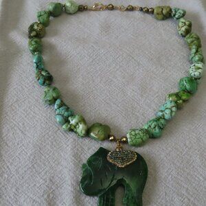 Believed to be Tibetan large bead turquoise nuggets with Jade elephant pendant. 19" long.