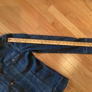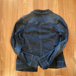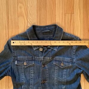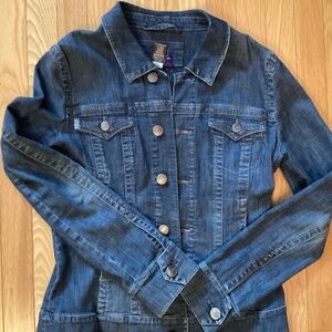 Classic blue denim jacket. Button-front closure. Two chest pockets.