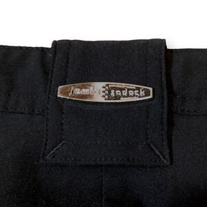 Resort wear ankle length golf pants by Jaime Sadock. These nylon / rayon blend athleisure pants have Jaime's signature styling, with front zipper angled pockets with pulls, a triangle back pocket flap with a beautiful silver and black geometrical button. Double studded belt loops, and a larger matching geometric button on the front closure with a zipper. Jaime Sadock silver and black metal logo on back center wide belt loop. Satin detailing on the front belt loops as well as matching satin detailing on the side of the right leg. Even with all Jamie's detailing these still give a clean beauty vibe.
