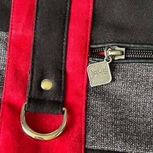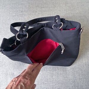 In like new condition! Beautiful bag black and grey with vibrant red interior. Exterior zip pocket, interior zip and non zip compartments.