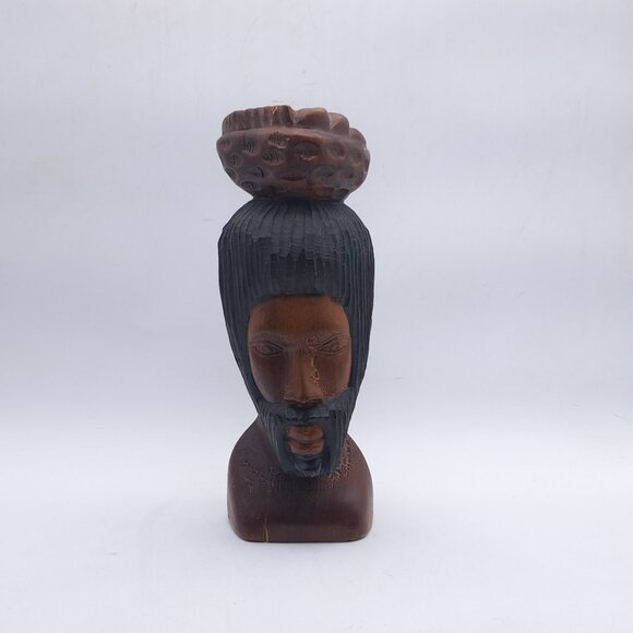 A hand carved wooden statue, most likely from Jamaica, of the head of a man carrying a small load on his head. There is wear as in the pictures.