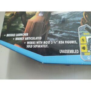 Avatar Movie AMP Suit collectible toy. The box highlights key features of the toy, including that it is a missile launcher, highly articulated, and works with most 3 ¾" RDA figures (sold separately). The box also indicates that the toy is unassembled and suitable for ages 5+. The lower right corner of the box advertises an RDA Suit Webcam I-TAG, which creates a 3D model that the user can control