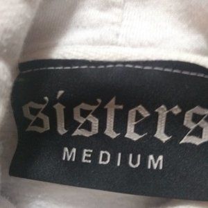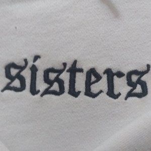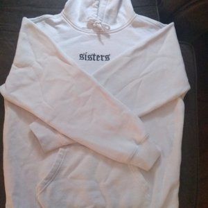 White slightly oversized woman's hoodie with black " sisters " logo.