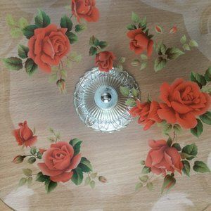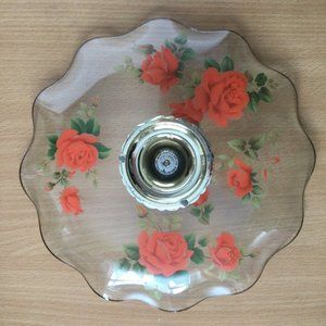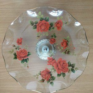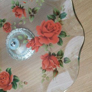 It is a beautiful glass cake stand/ candy server with a metal stand/foot and a glass plate with red roses and a gold gilt scalloped edge.