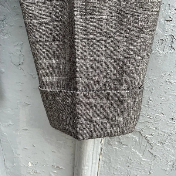 Fixed cuffs and a slouchy silhouette relax the polished feel of plaid James Jeans trousers. Slant hip pockets and button-welt back pockets. Hook-and-eye closure and zip fly.