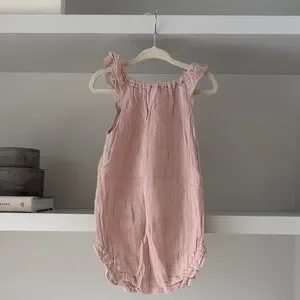 Soft pink romper with ruffle straps. Lightweight gauze fabric. Snap closures at the bottom for easy changes. Sweet gathered neckline. Gentle, timeless style. Some faint untreated marks as shown