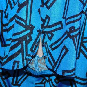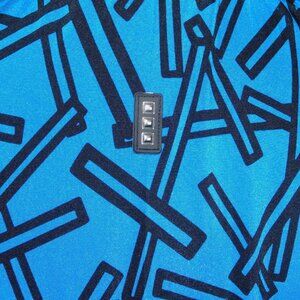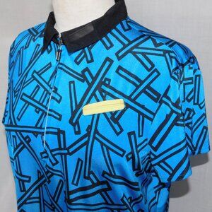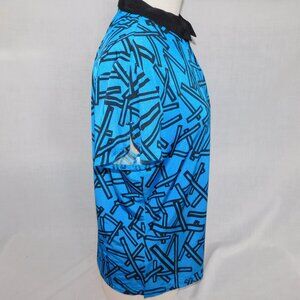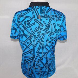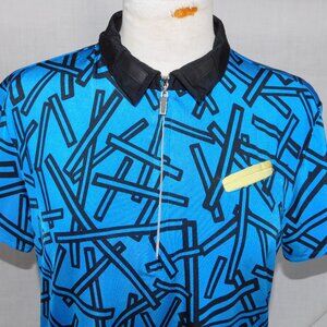 This Womens Large Jamie Sadock Blue Black Abstract 1/4 Zip Golf Polo Shirt is in Excellent clean bright condition. Shirt is 92% Polyester - 8% Spandex - machine washable. Features matte ribbon detail on collar, yellow faux pocket on chest and 6 silver studs on the split on arm cuff.