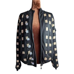 Jamie Sadock black geometric pattern silk blend lined zipup cardigan Medium