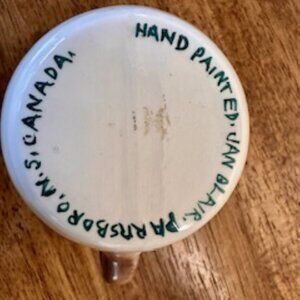 This beautiful vintage pitcher is a hand-painted Canadian treasure by artist Jan Blair from Parrsboro, Nova Scotia. Featuring a striking maritime sailing ship scene against a soft sky blue and brown background, it's a charming piece of collectible studio pottery that embodies East Coast artistry. Signed clearly on the base and body, it's both decorative and functional, ideal for collectors or lovers of nautical themes.
