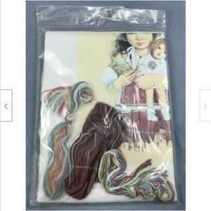Vintage from 1970s, "Lydia and the Shirley Temple Doll" crewel embroidery kit is adapted from the original watercolor by Jan Hagara. Needle Treasures Stitchery Kit made in USA by Johnson Creative Arts. Kit is new/unopened. Finished size 10x14".