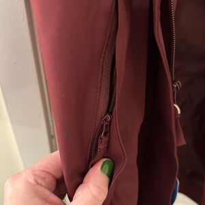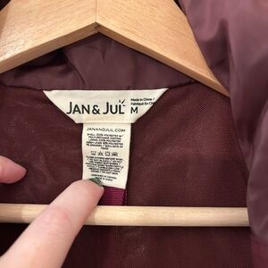 Burgundy rain coat from Vancouver brand Jan and Jul. Adjustable hood and back vent with reflector. Elastic cuff sleeves. Zippered inside pocket and two zipper hip pockets.