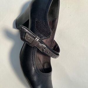 Preloved black comfy shoes. Grey accent on strong Velcro strap. Leather upper with manmade detail.