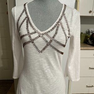 Silver and gold embellished front. 3/4 sleeves, which are perfect for petites.