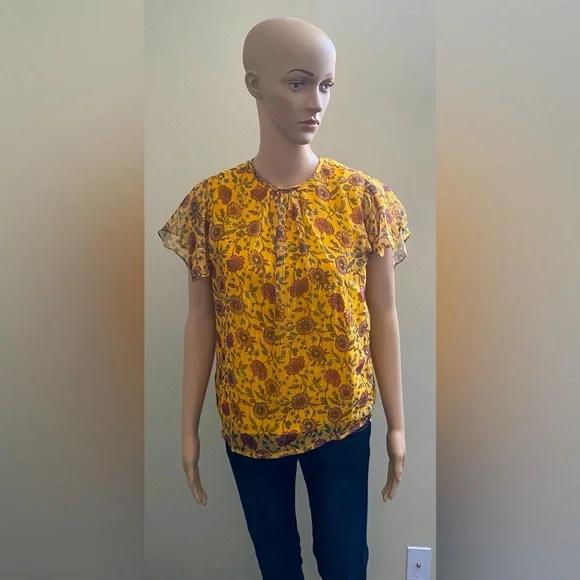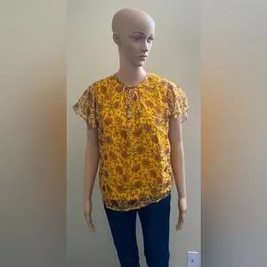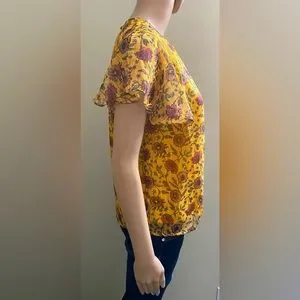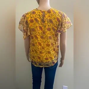 Mustard Poly Georgette Floral Print Top. Short Bell Sleeve. Single Back Button Closure. Fully Lined