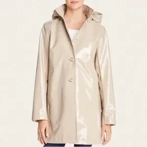 This beautiful and elegant coat is fully lined in satin lining and features a fully detachable hood, tonal enamel buttons and lined pockets.