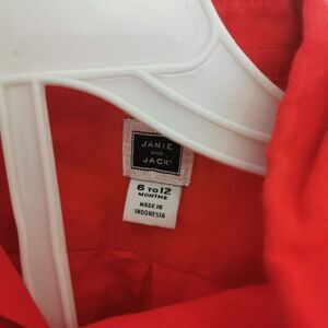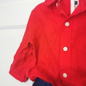 blouse is a linen like fabric, size 6-12. no rips, has a couple light spots near the pocket. but not very visible.