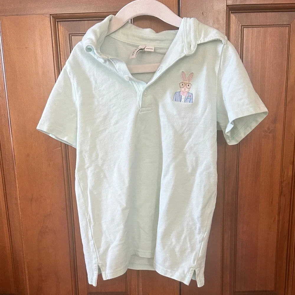 Charming light blue polo with an embroidered bunny. Perfect for casual outings.