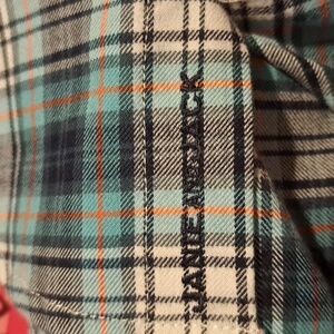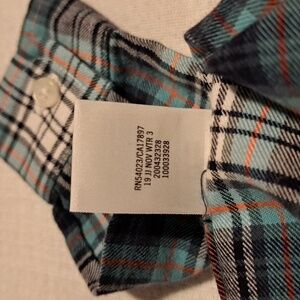 Janie and Jack boys size 3-6 months flannel blue, green white with orange stripe, plaid button down shirt, 1 shirt pocket.