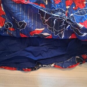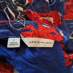 Janie & Jack size 4 floral lined dress from summer 2021. opened back with bow. ruffled sleeves, blue red & white floral design. metallic vertical lines. no defects