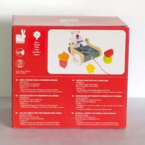 Janod Zigolos Pull Along Shape Box Bear is your child's best buddy around the house or out for walks. The rolling bear features wood and rubber wheels and a square shape sorter cart. The sorter tray has colored dots in each section, so if your child can't match the shape, they can sort by color and a 20in.(50cm) rope to pull it with. The 5 shapes are a heart, star, moon, triangle and square. Recommended for children aged 1-3 years old.