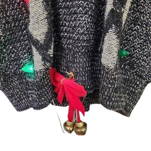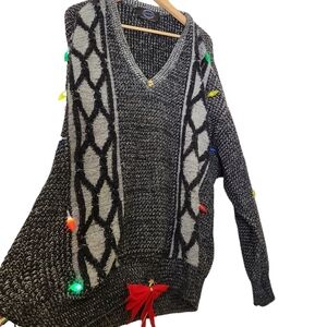 Jantzen sweater company,black and gray knitted long-sleeve v-neck, ugly christmas sweater. Long-sleeved, v-neck front, stretchy cuffs and waistband, added Christmas lights,red bow with bells and turn on/off switch. Super cute, comfortable and in good condition size XL