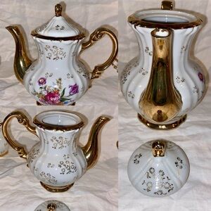 * Condition: very good condition, very mild cosmetic imperfections can be found throughout the set. here are the most noticeable flaw: * the Tea pot Lid is cracked and Chipped and has a repair (1)* a chunk of the gold plated on 1 of the saucer is missing (2)*