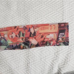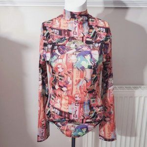 Anime-manga print, cartoon, graphic, lightweight, mock neck, snap button closure, long sleeved, light stretch. Rare.