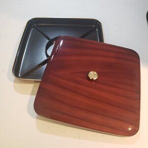 It has a lacquered base portion, sectioned plastic inside, and a lacquered lid.