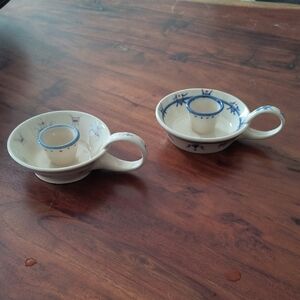Elegant Vintage Japanese ceramic candle holders featuring charming blue and red accents.