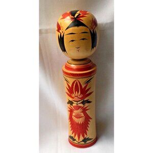 Japanese Kokeshi Doll Floral Design Flowers 12 “ Signed Maker Mark
