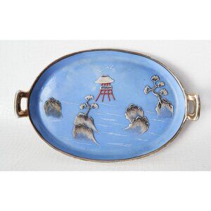 For your consideration is a vintage five piece Moriage condiment set with a high relief decoration of a pagoda, trees and birds over a blue background.