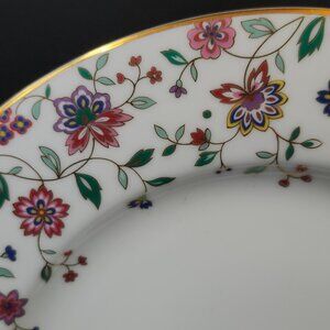 Beautiful handmade Royal Queen Ultra White Porcelain dinner plate. Made by Tachikichi exclusively for Royal Queen Club International. Artist signature Josaphine. This beautiful gold trim plate has a bright, Japanese styled floral border. Heavy and durable despite it's elegance.