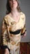 Golden beige colored dress with empire black contrast waistband panel that contors to long tie sash in back.