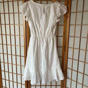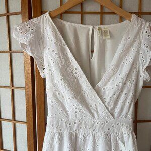 🍃 lovely eyelet 100% cotton white v-neck wrap (not actually wrap, but wrap-style) dress. very very minor stain as pictured in the back by the neck (not visible unless you look super closely). minor snags. otherwise in good condition!
