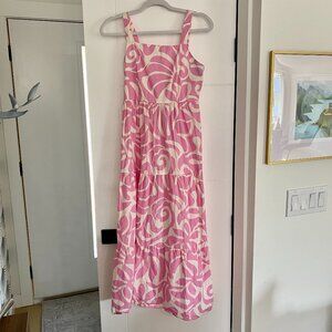Pink and white Japna midi-dress with thick straps and a beautiful fitted bodice with a full skirt. This Japna dress is a size small and made of 100% cotton.