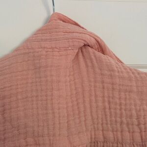 Chic coral button-down shirt. Features textured fabric and front pockets. Perfect for casual wear.