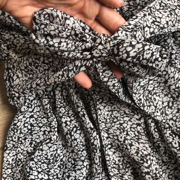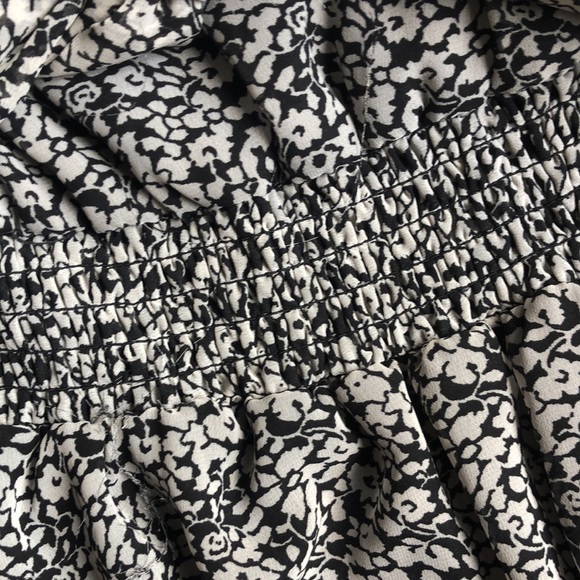 FEATURES: vneck, floral, black and white, stretchy was it, keyhole back, button, mini dress, ruffles, sheer, long sleeve, lined