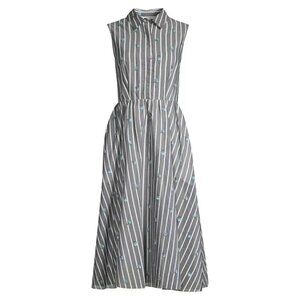 This striped shirt dress is woven from cotton and silk patterned with delicate floral embroidery