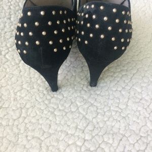 Pointed toe, black leather front, suede back, 90mm (3.5”) heels, silvery/gold studded heels, size 38.5/8.5