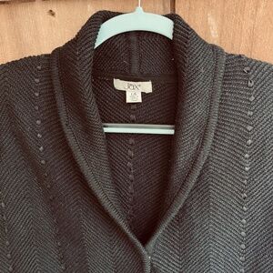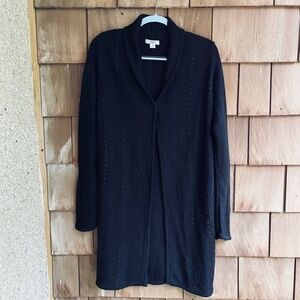 Jax Vintage Long Merino Wool Black Cardigan Open Front Ribbed Ribbon Trim L (XL)