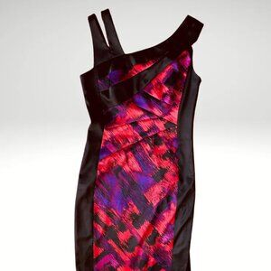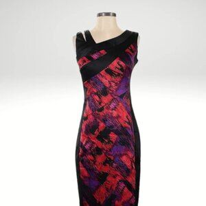 This striking midi dress by Jax features a bold asymmetrical graphic design in fiery red against a solid black backdrop. The sleeveless style enhances its modern appeal, making it a perfect choice for a standout look at any event.