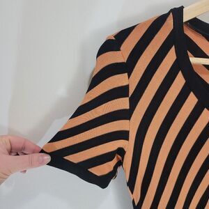 Nice weighty knit fabric diagonal stripes of peach and black with black cuffs and v neck collar. Flares out towards hem for a nice non clinging drape from the waist down. Hem splits at either side too.