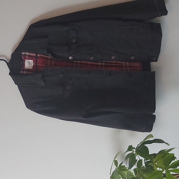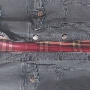 Dark grey/black Jean jacket with reb plaid lining. Slightly oversized, boyfriend fit.