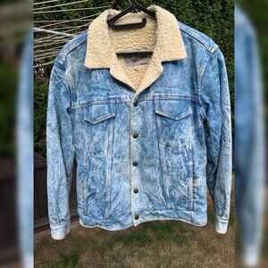 Jean Jacket - Denim Fleece Bomber - Vintage Acid-Wash Button-Down Coat, Men's 34