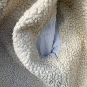 - There is no fabric makeup tag, so I cannot confirm what it's made out of. What I can confirm is this is fleece-lined, it feels/smells like wool (but who knows, could be a blend) in the torso and collar area - the arms are lined in what feels like white cotton.