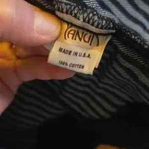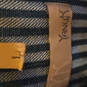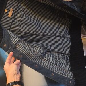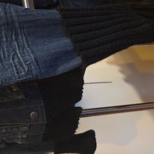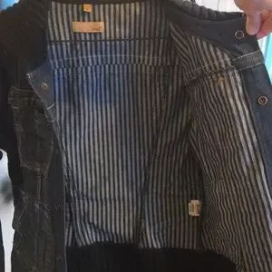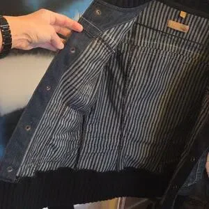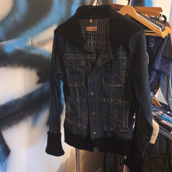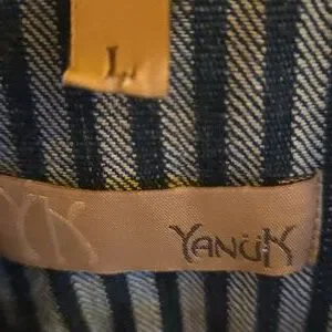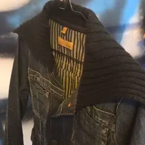 Yanuk vintage womens jean jacket size large...more like a medium...with sweater edging at neck, bottom, and sleeves...striped jean interior...excellent condition