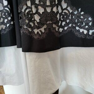 Elegant A-line skirt by Jean Paul Gaultier. Features intricate black lace overlay on white fabric. Perfect for stylish occasions.