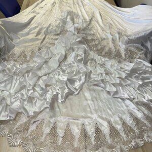 Jean Phoenix Bridal wedding dress with puffed shoulders, lace sleeves, lace v-neckline, and a long train with ruffles.