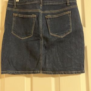 Dark denim, short skirt with front bottoms. Two front pockets and two back pockets. Size medium.